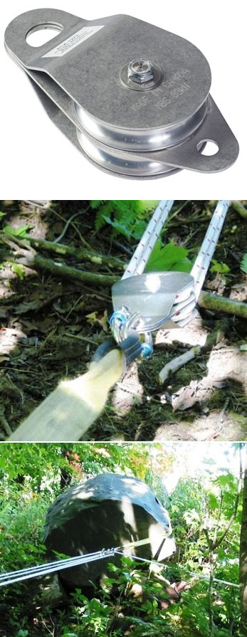 - En utilisant notre poulie double (ancrée à la charge) et notre poulie simple, vous triplez la force exercée sur la charge, soit 7500 lb (3400 kg).