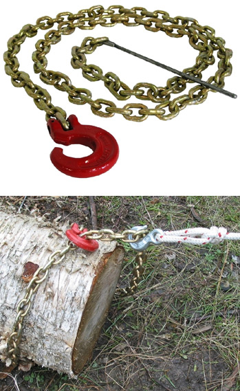 - Une aiguille en acier de 30 cm (12") fixée au bout de la chaîne permet de la pousser facilement sous les billes de bois ou de l'insérer dans le cône de débardage.