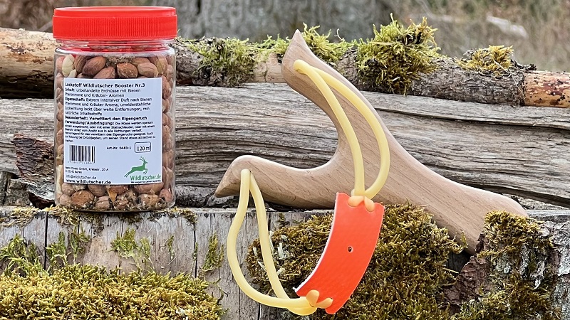 Les noisettes sont disposées individuellement avec parcimonie, éventuellement à l'aide de la fronde depuis le poste d'affût ou de battue dans toutes les directions. Permet de couvrir votre propre odeur. A utiliser également lors des chasses en battue pour rendre votre poste un peu plus attractif.