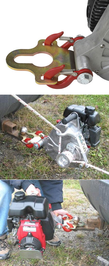 - Fixez le treuil à la plaque à l'aide de ses crochets et glissez la plaque sur la boule de votre véhicule. Vous êtes prêts à tirer !