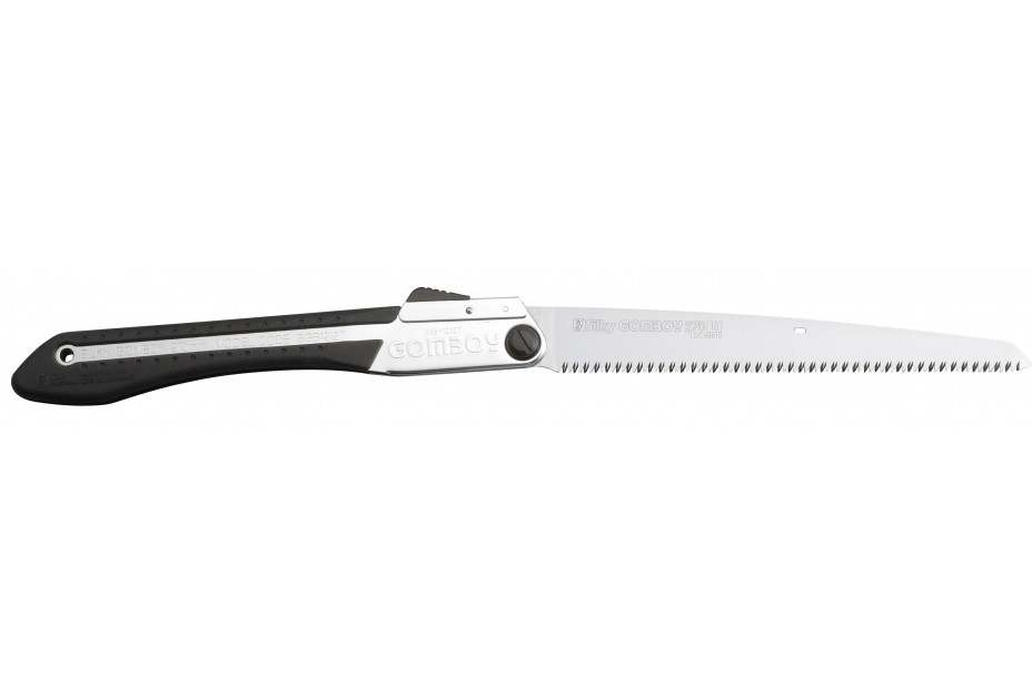 La poignée en caoutchouc de la Gomboy assure une bonne prise en main confortable. Le trou de la poignée permet de passer un mousqueton ou corde à la scie.