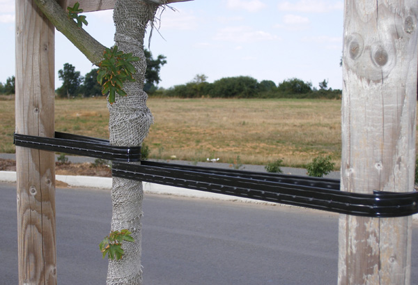 Ligature destinée à maintenir les arbres en place durant leur croissance en liant la plantation et les tuteurs en bois de manière non traumatisante.